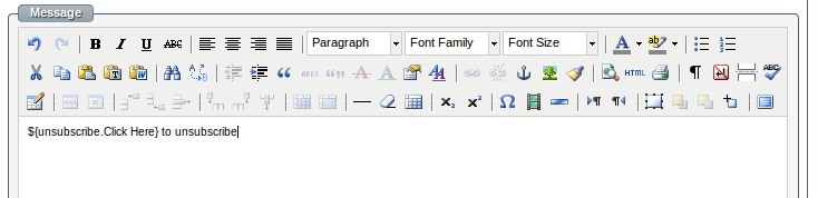 ${unsubscribe.Click Here} will add the link to unsubscribe the newsletter. "Click Here" is the link text